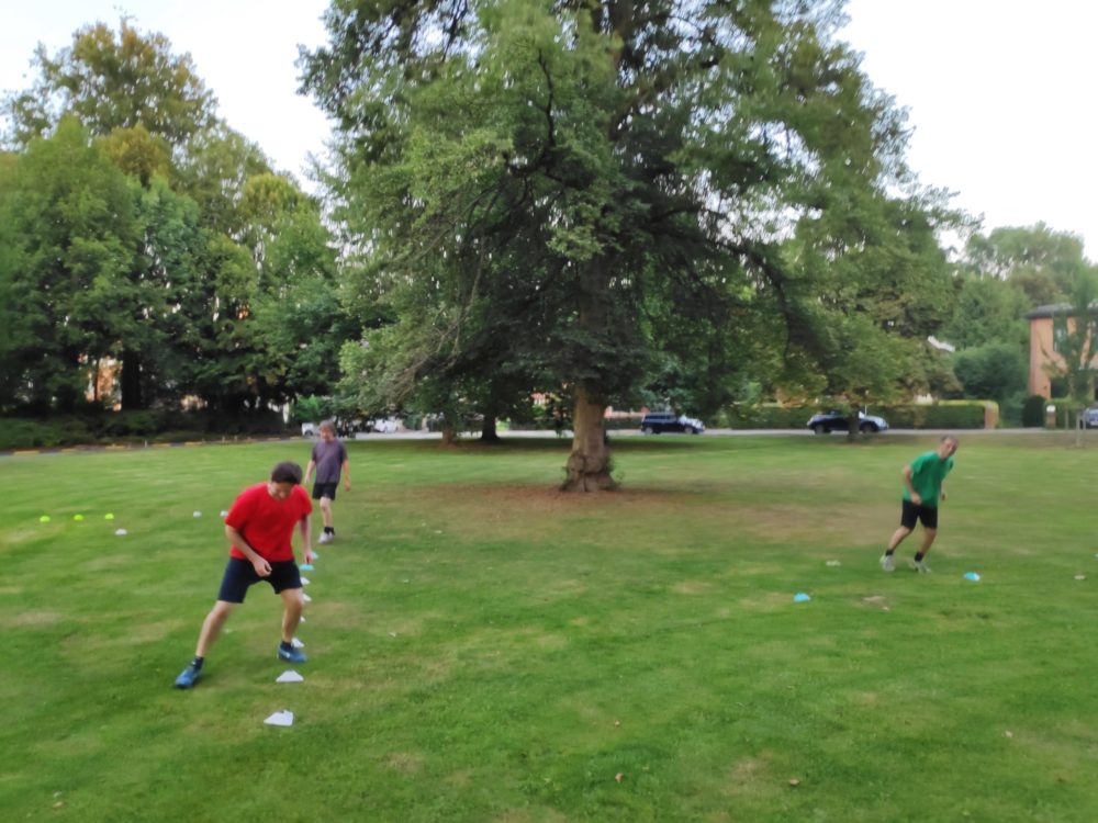 De training was opgebouwd uit 4 onderdelen en volledig coronaveilig in opgezet. Eerst was er een opwarming, een tweede onderdeel was training van voetenwerk, het derde onderdeel was een parcours in het park dat de bovenbeenspieren testte en als laatste “core”-oefeningen en de stretching.
